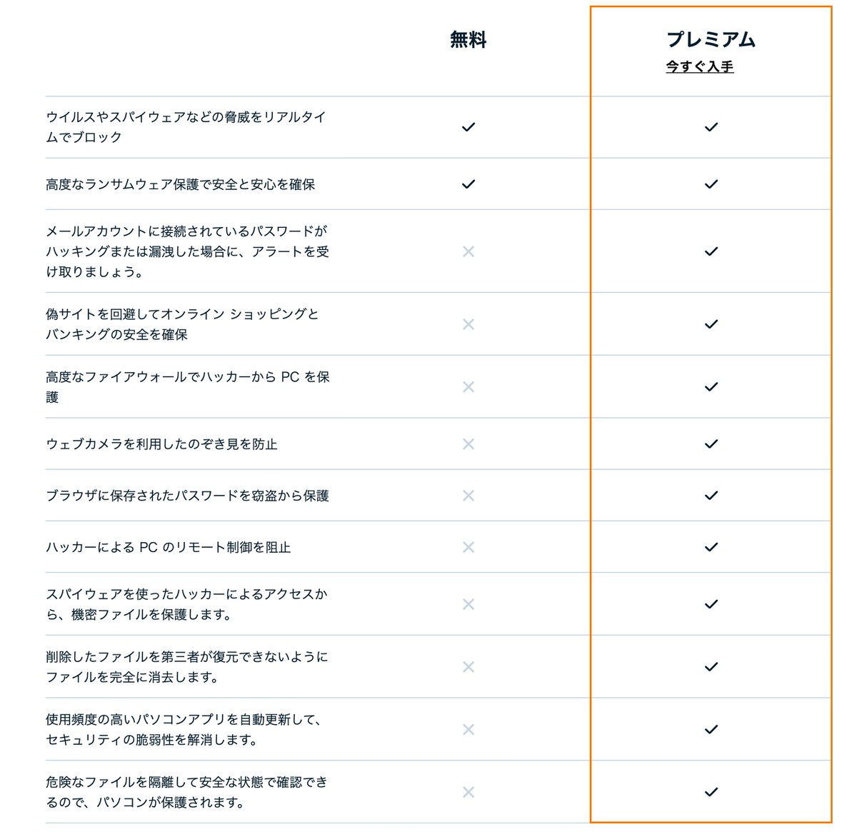 | 機能・項目 | 無料版(Free Antivirus) | 有料版(Premium Security) |